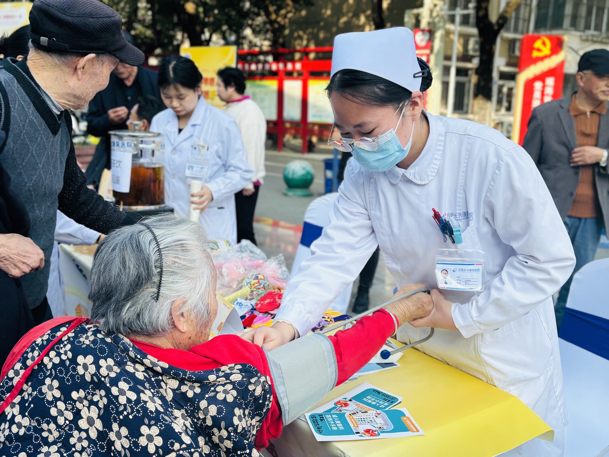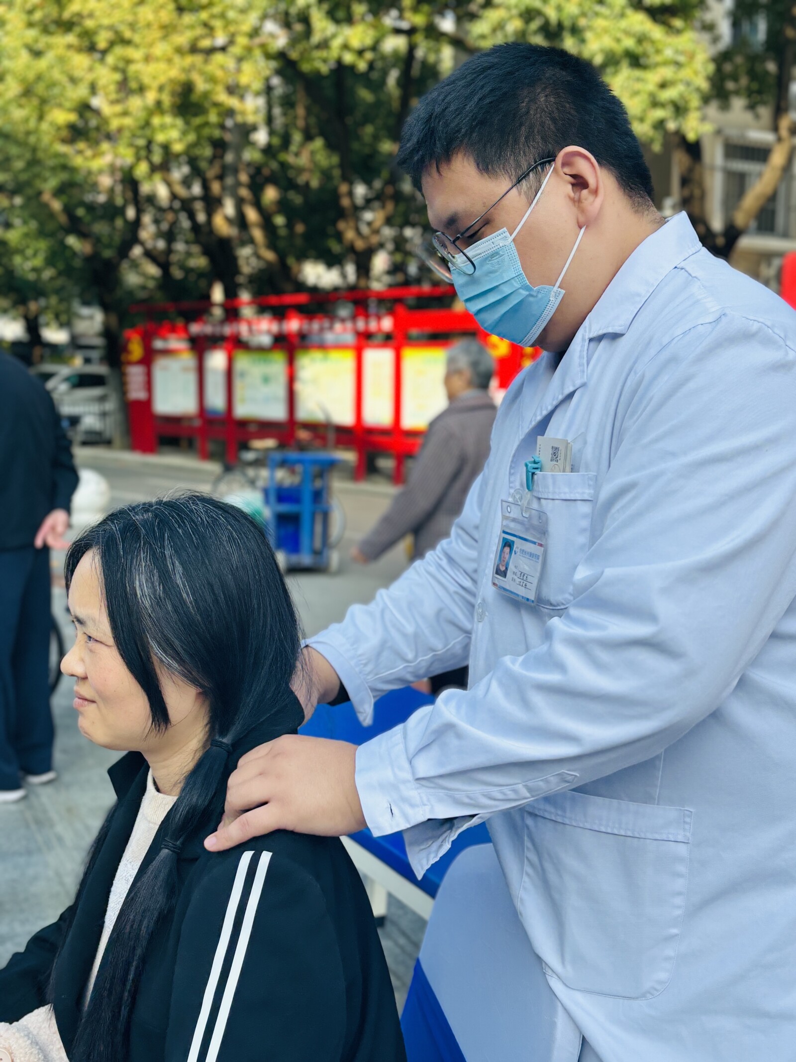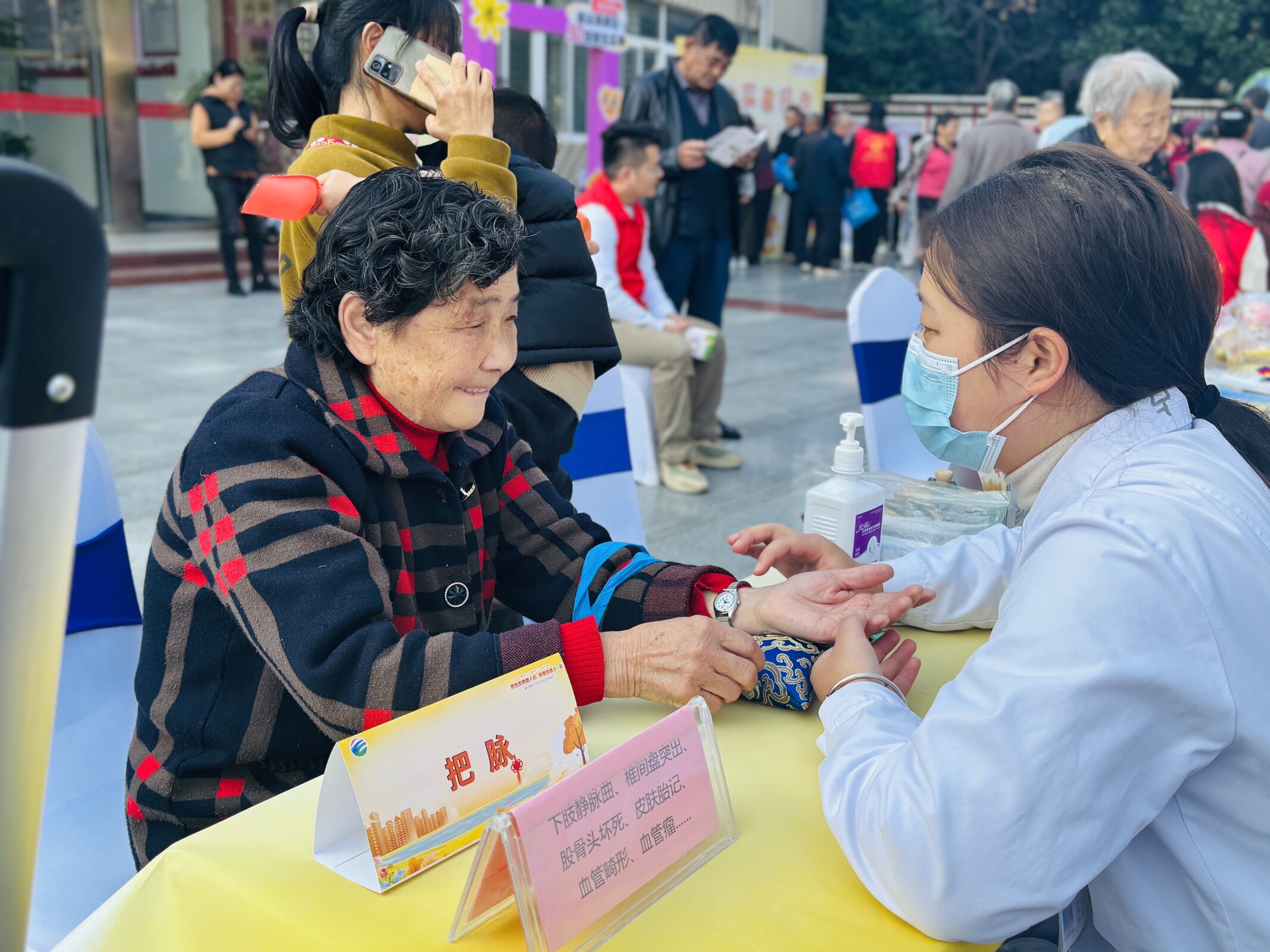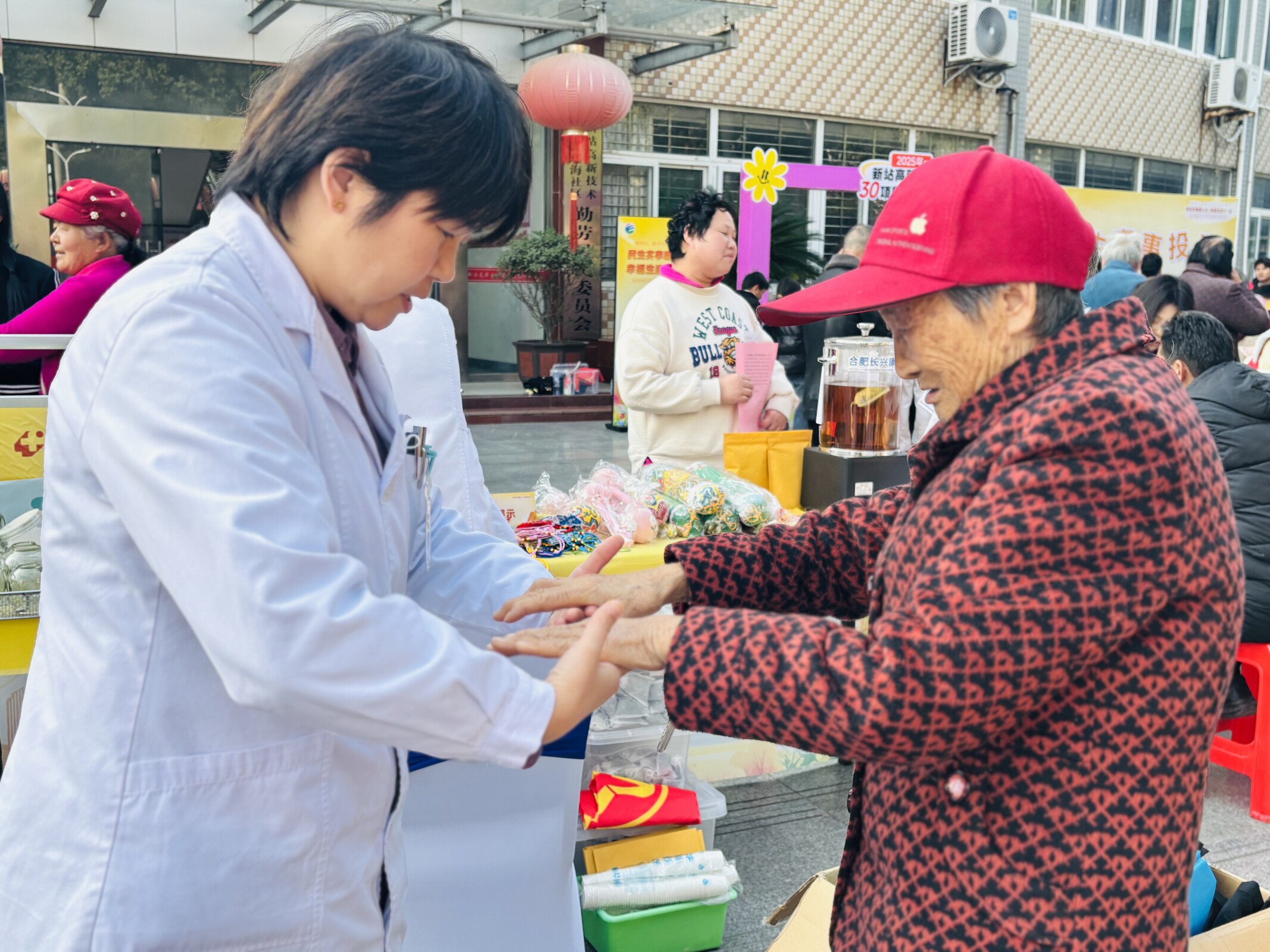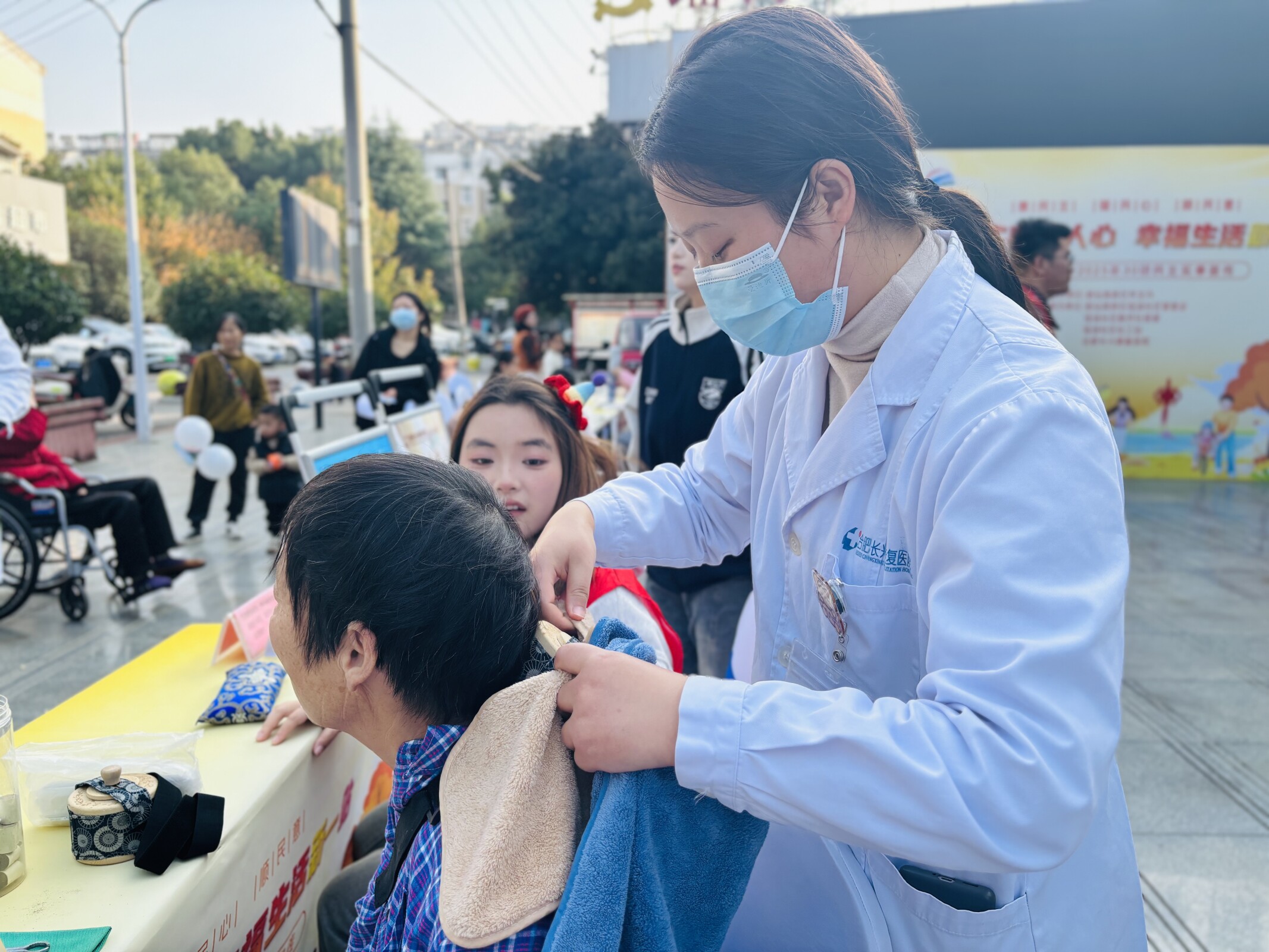 活动现场,多元服务力量交织成一张细密而温暖的民生保障网。在义诊区,我院医护团队不仅为居民提供血压测量、脉诊问询及慢性病用药指导,更耐心传授家庭康复要领。“以前专门跑医院才能学到的康复知识,现在下楼就有专业人员手把手教,太方便了!”刚学会一套保健动作的张阿姨赞不绝口。一旁的中医特色服务区同样人气高涨,治疗师为居民提供推拿、艾灸等服务,免费养生茶饮摊位前也排起小队。许多居民围在展台前,饶有兴致地学习中药香囊、艾灸枕的制作方法,近距离感受传统中医药的独特魅力。