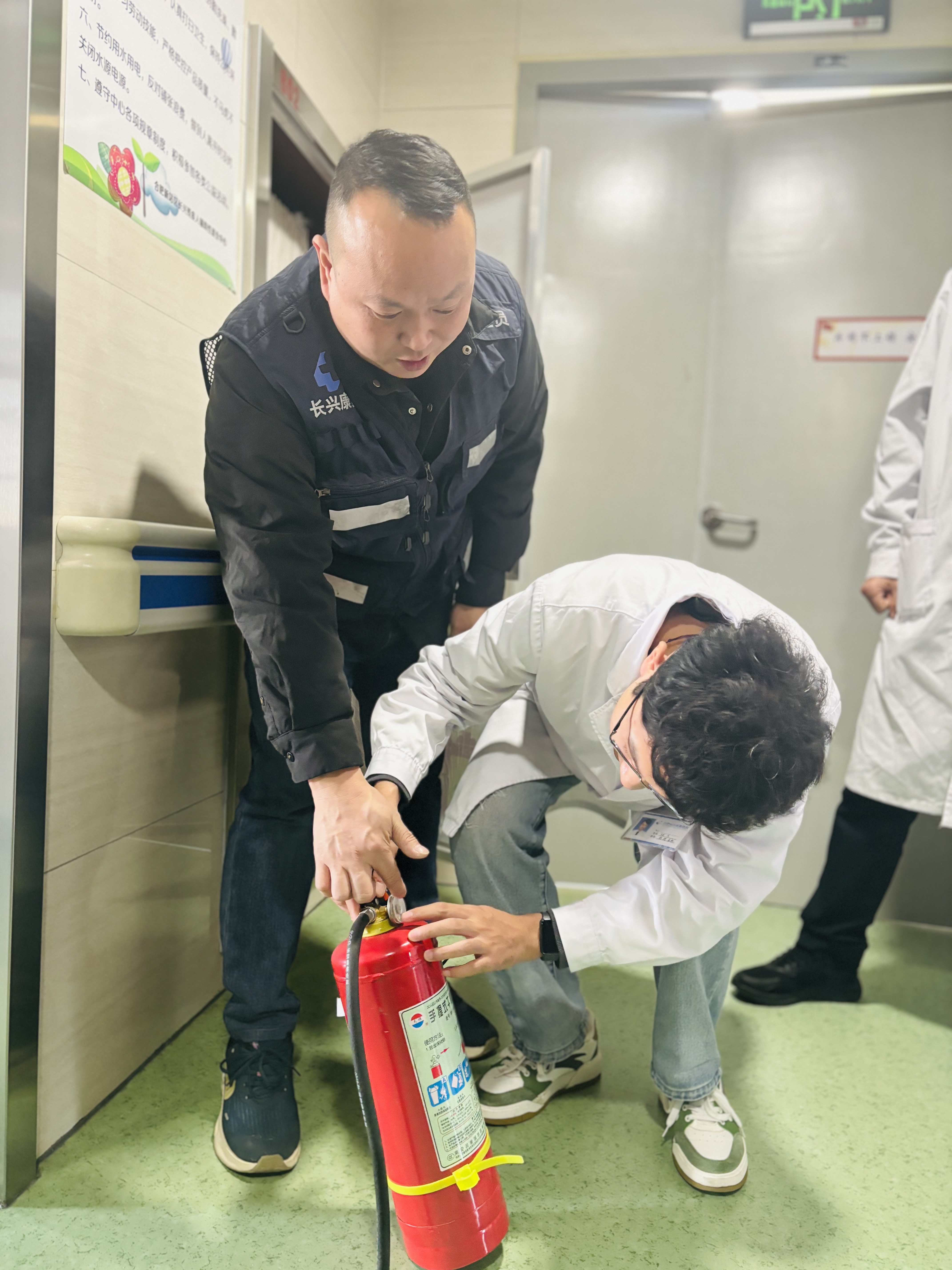 演练开始,现场结合诊疗环境与就业中心工作特点,详细讲解了灭火器的类型、适用场景及日常检查标准,同时现场演示了“提、拔、握、压”的标准操作流程,让参训人员清晰掌握操作核心要领。