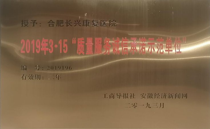 2019年3月15日,合肥长兴康复医院荣获3.15质量服务诚信承诺示范单位。